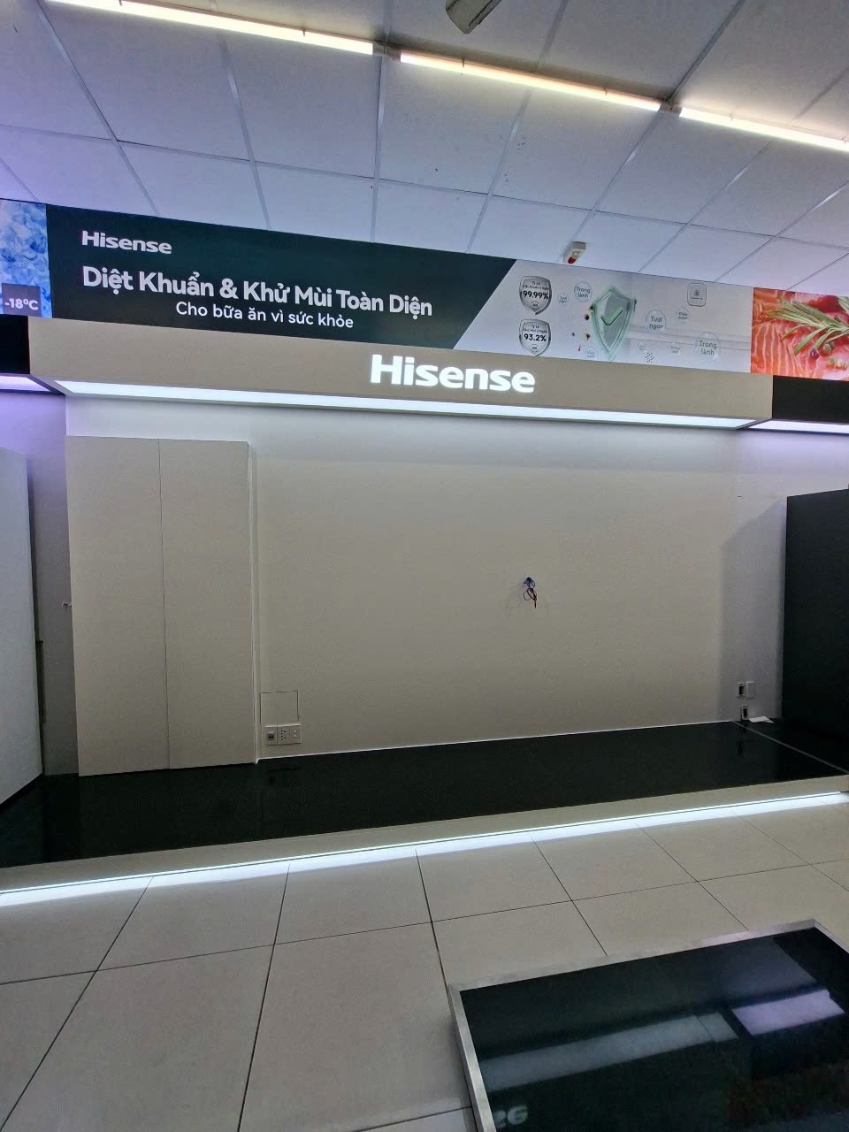 Ánh sáng chính là yếu tố tạo nên sức hút và chiều sâu cho không gian showroom. Do đó, không gian cần sử dụng đèn LED âm trần hoặc LED thanh chạy dọc theo các cạnh kệ. Ánh sáng trắng hoặc trung tính giúp phản chiếu độ bóng của bề mặt tủ lạnh, tạo cảm giác sang trọng.