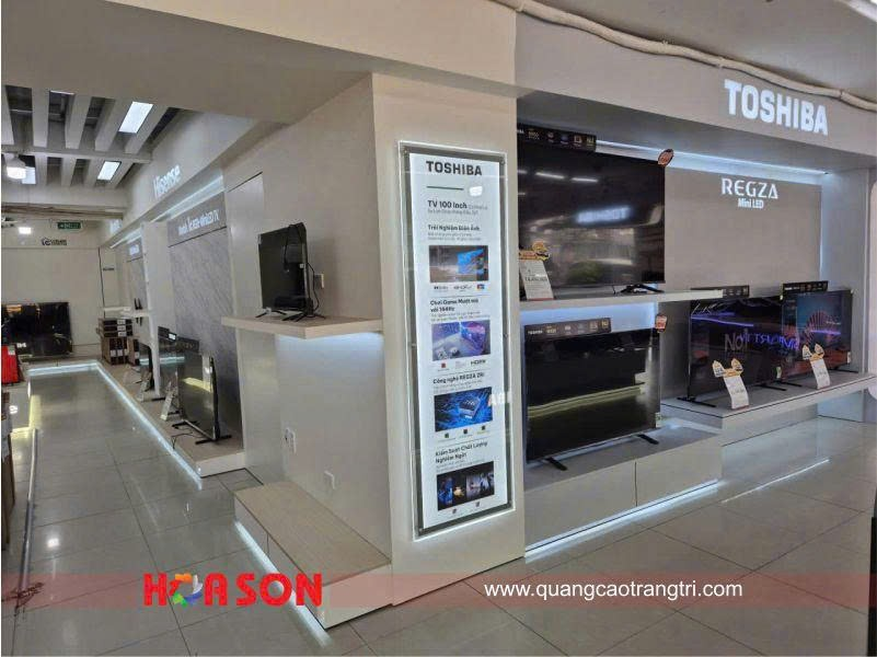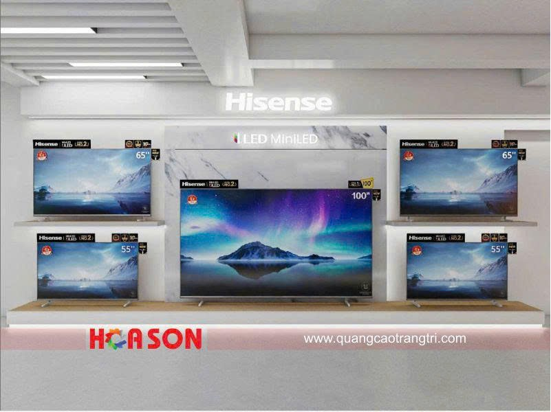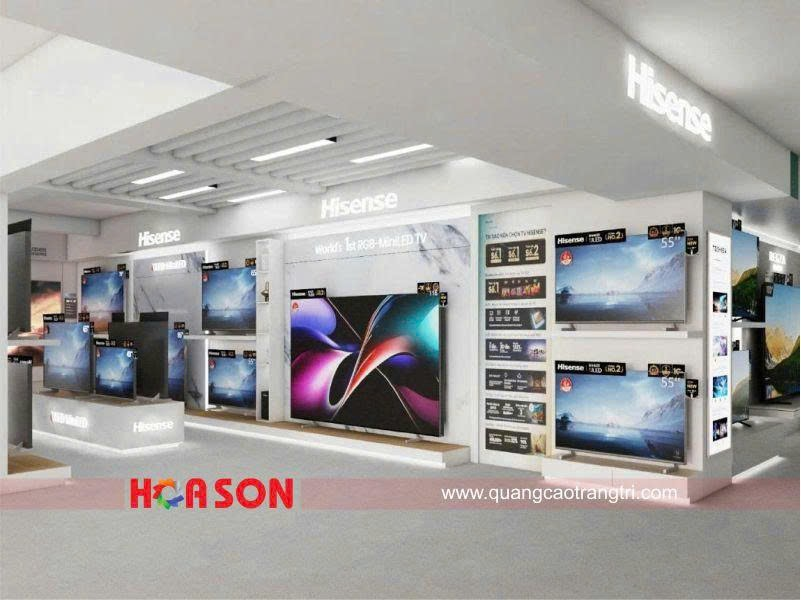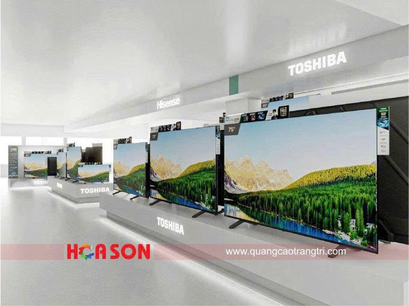 Thị trường tivi không ngừng đổi mới công nghệ. Vì vậy kệ ốp vách trưng bày do Quảng cáo trang trí Hoa Sơn thực hiện luôn linh hoạt, dễ mở rộng: