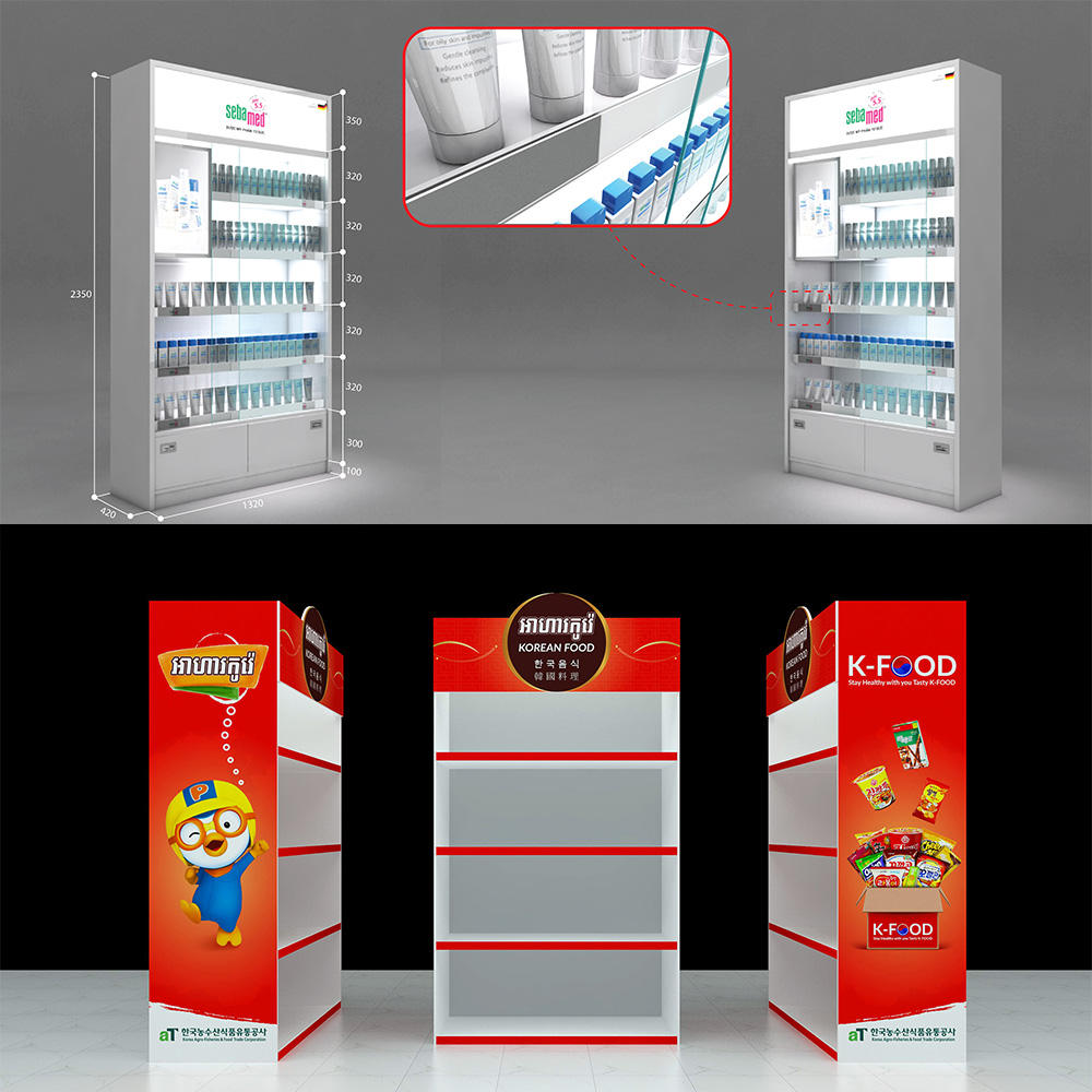 + Tủ trưng bày siêu thị, nhà thuốc, tủ mỹ phẩm…quầy, kệ, ụ trưng bày